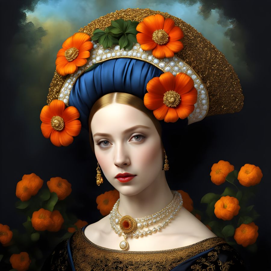 Les tissus luxueux, les bijoux détaillés, les textures délicates du velours ou de la dentelle, sont restitués avec une précision quasi picturale. L’ajout de fleurs vives — comme ces coquelicots orange qui encadrent délicatement les visages — introduit un langage visuel audacieux. Elles dialoguent avec la symbolique florale chère aux primitifs flamands, tout en affirmant une liberté créative propre à notre époque.